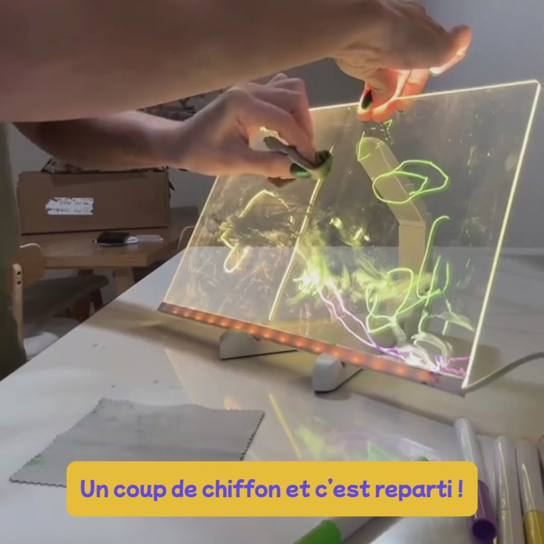 Tout se passe sur la tablette : on dessine, ça s’illumine, on efface, on recommence sans feuilles qui traînent et sans feutres sur les meubles.